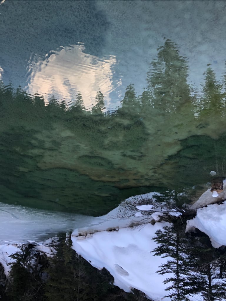 Je ne l'ai pas vu tout de suite ce petit personnage accroupi sur le bord du tableau. J'étais prise dans l'émeraude des sapins et le manteau de neige. C'est un tableau qui parle de silence, de concentration et des gestes essentiels : préparer le repas, se réchauffer, regarder la rivière... et autour, l'immensité.